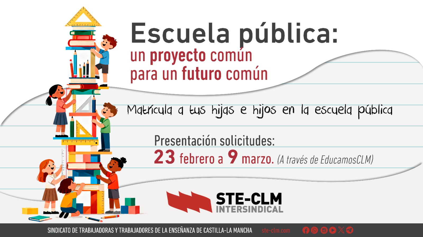 Desde STE-CLM os informamos que el 23 de febrero de 2026 se abre la Convocatoria de admisión de alumnado para el curso 2026/27 en centros docentes públicos y privados concertados que imparten las enseñanzas del segundo ciclo de Educación Infantil, Educación Primaria, Educación Secundaria Obligatoria y Bachillerato.